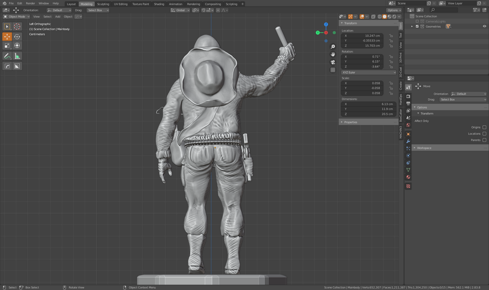The zipped file include: MacReady main character (base included), Accessories. Standard sizes: X= 6.13cm; Y= 11.9cm; Z= 20.5cm (base excluded).